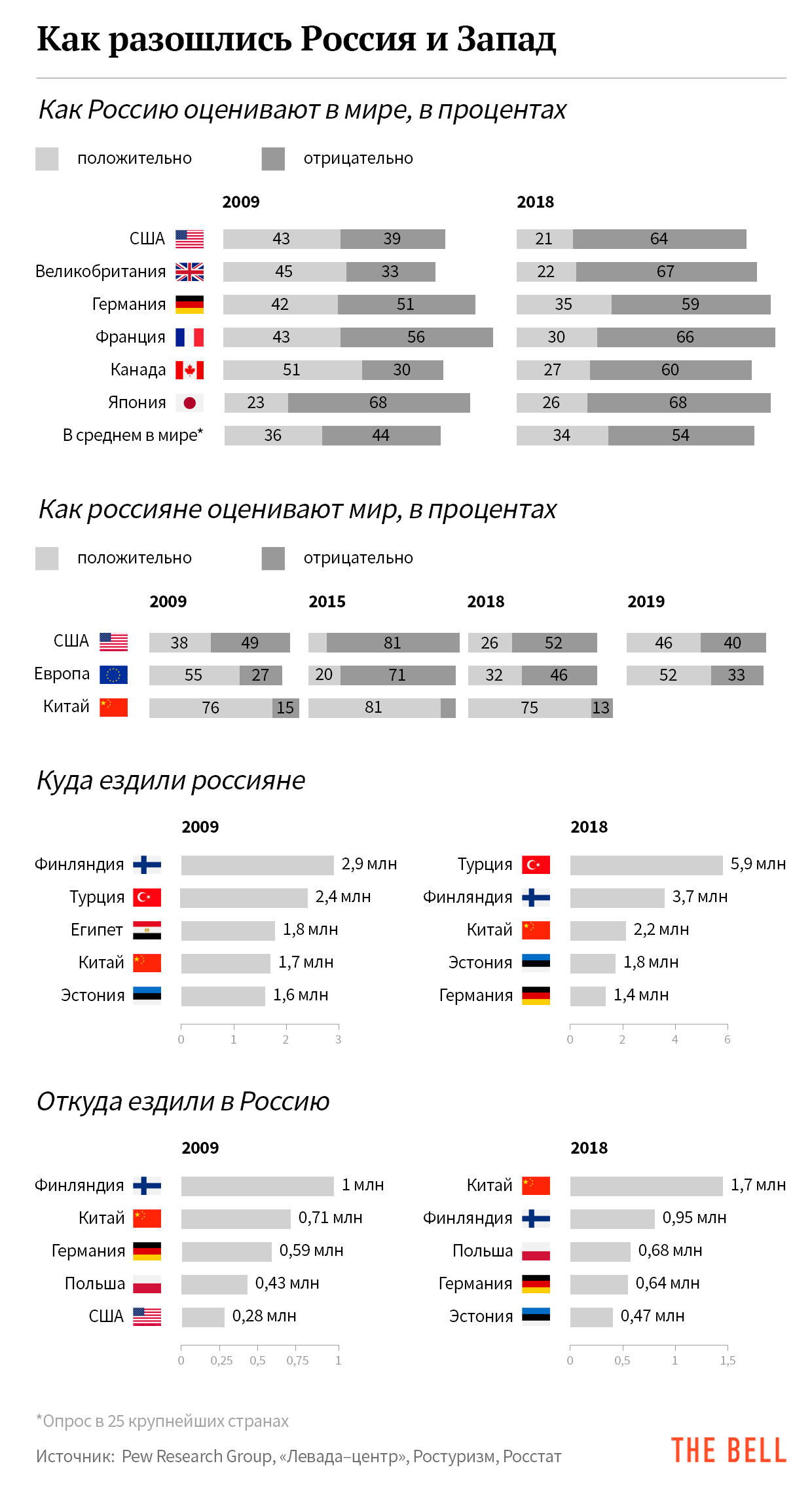 2014 год с присоединением Крыма, началом войны в Донбассе и сбитым рейсом MH-17 все изменил: на ближайшие несколько лет Россия оказалась в почти полной международной изоляции, из которой может начать выходить только сейчас, и под санкциями ЕС и США. Но главное — россияне все больше выпадают из глобальной жизни, а взаимное недоверие с жителями западных стран растет.