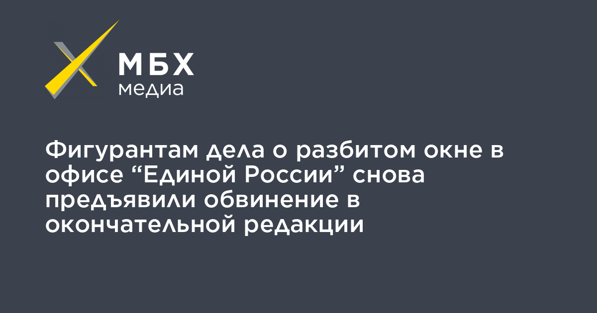 Фигурантам дела о разбитом окне в офисе «Единой России» снова предъявили обвинение в окончательной редакции, об этом сообщил адвокат «Правозащиты Открытки» Олег Елисеев, представляющий интересы одного из фигурантов Андрея Ейкина.