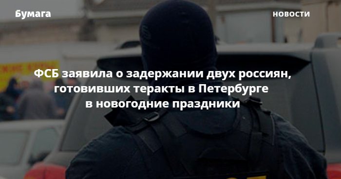 Федеральная служба безопасности России сообщила, что задержала двух россиян, которые готовили теракты в Петербурге в новогодние праздники. Об этом написал ТАСС со ссылкой на спецслужбу.