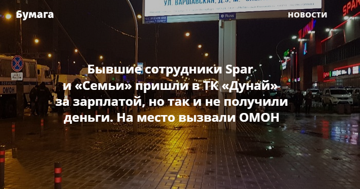 Бывшие сотрудники магазинов Spar и «Семья», закрывшихся накануне Нового года, 30 декабря стояли в очередях за зарплатами в ТК «Дунай» в Купчине. Вечером в торговый комплекс вызвали ОМОН.