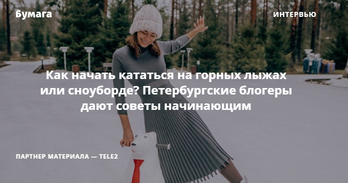 Для партнерского материала с Tele2 «Бумага» поговорила с петербургскими блогерами, которые занимаются горными лыжами и сноубордингом. Они рассказывают о том, как начали кататься, какие склоны любят и что делают в отсутствии снега.