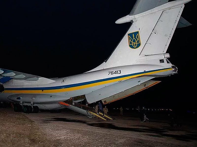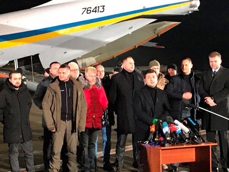 Самолет после посадки на аэродроме Борисполь Фото: Пресс-служба президента Украины Вместе с родными бывших заключенных, вернувшихся с Донбасса, в Борисполе встретили президент Владимир Зеленский, министр обороны Андрей Загороднюк и начальник Генерального штаба Украины Руслан Хомчак. Украинский лидер произнес речь прямо на взлетно-посадочной полосе.