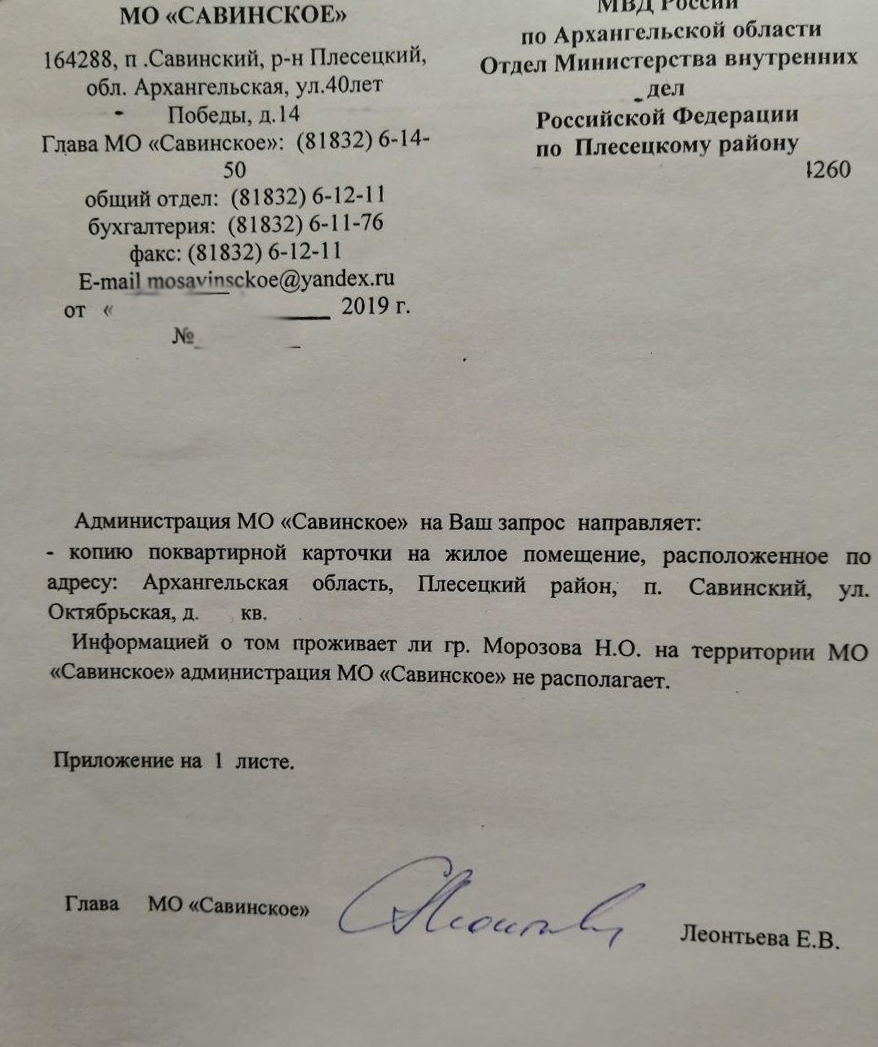 Степановой удалось получить официальный ответ от главы администрации МО "Савинское" о том, что Наталья Морозова не проживает по адресу, указанному в заявлении в полицию. Теперь волонтер намерена подать заявление на сотрудников полиции, допустивших проверку, которую она считает незаконной.