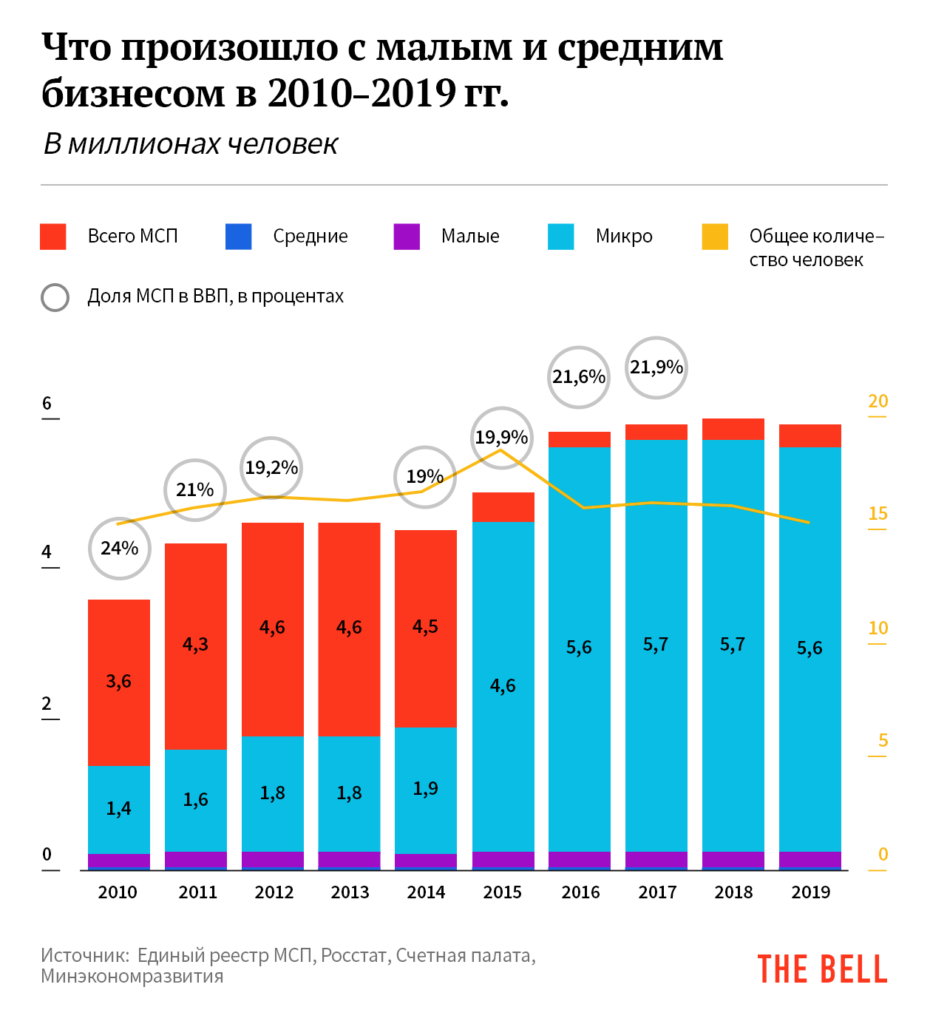 В 2018 году Владимир Путин поручил довести долю малого и среднего бизнеса в экономике с менее 22% до 40% в ВВП к 2025 году. По меркам развитых стран, даже 40% — не так много, во многих странах эта доля близка или выше 50%. Но шансов выполнить поручение президента у правительства немного. Например, мэр Москвы Сергей Собянин сомневался, что вклад малого и среднего бизнеса в российскую экономику можно довести даже до трети — для этого придется «закрыть “Газпром” и “Роснефть”» или раздать предпринимателям месторождения. Действующих темпов явно недостаточно — за последние четыре года доля МСП в экономике подросла всего на 2 п.п.
