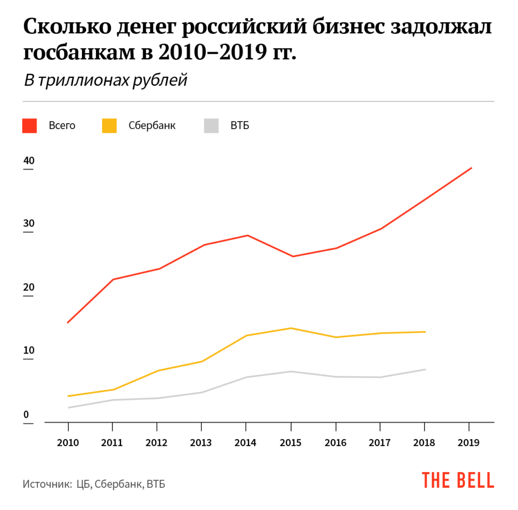Но нефтегазовая отрасль оказалась не единственной, где государство в прошлом десятилетии серьезно упрочило свои позиции. Еще большие трансформации произошли в гораздо менее политизированном финансовом секторе. Чистка банков, за которую взялась Эльвира Набиуллина, привела к тому, что доля государства в нем к концу 2010-х дошла почти до 70%. Из более 1000 банков, существовавших в России 10 лет назад, осталось 444. Объем кредитов, которые выдали за 10 лет юрлицам два крупнейших госбанка — Сбербанк и ВТБ, вырос в три с половиной раза.
