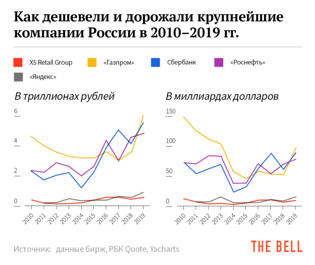 Стоят крупнейшие российские компании сейчас примерно столько же, сколько в начале десятилетия. The Bell сравнил капитализацию пяти «голубых фишек»: свои показатели в долларах после обвала рубля в 2014 году отыграли Сбербанк, «Роснефть» и «Яндекс», но значительно капитализация выросла только у последнего. «Газпром» по сравнению с 2010 годом в долларах подешевел почти вдвое, X5 Retail Group потеряла 20%.