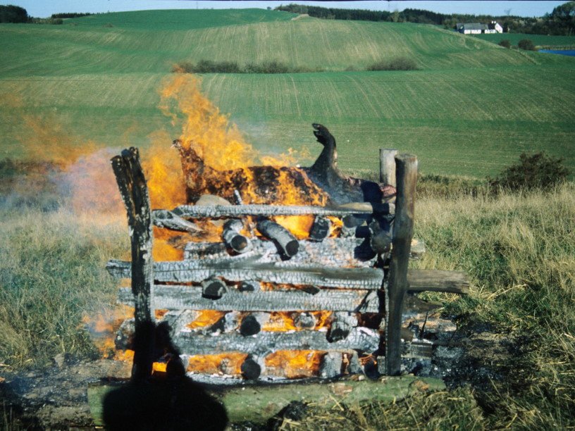 Умерший был сожжен на куче дров размером примерно три на два метра, сложенной между вкопанными вертикально столбами. После сожжения кости были извлечены и, вероятно, захоронены в другом месте. На данный момент от костра сохранились толстый слой золы, редкие фрагменты костей и следы от столбов.