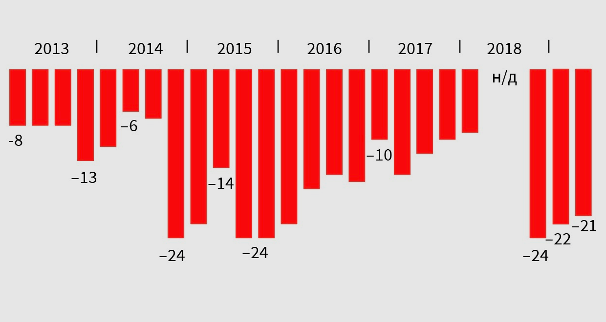 Численность среднего класса начала резко сокращаться в 2014 году. Одновременно упал и «индекс Иванова», который отражает потребительскую уверенность россиян. Если в начале 2014 года он был на уровне -6%, то в 2015-м рухнул до -24%. Новое глубокое падение произошло в 2018 году — после него Sberbank CIB на время даже прекратил публиковать значение индекса.