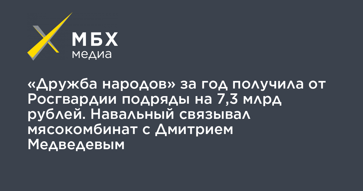 Мясокомбинат «Дружба народов», который по данным ФБК принадлежит близким к Дмитрию Медведеву людям, за 2019 год получил от Росгвардии 217 контрактов общей стоимостью 7 млрд 347 млн рублей, подсчитало «МБХ медиа» на основе данных «СПАРК-Интерфакс».