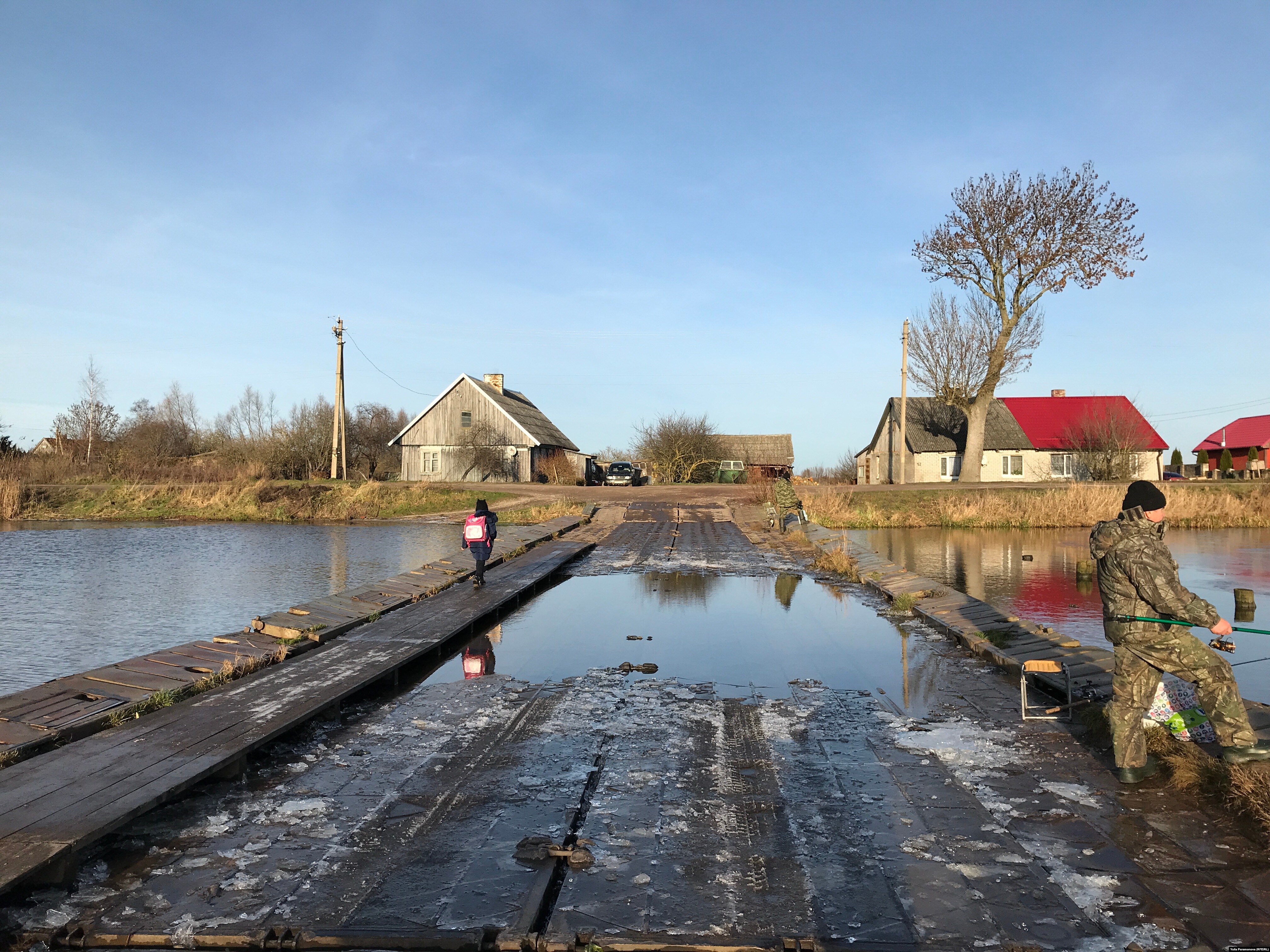 Под Калининградом жители поселка, отрезанные рекой от "большой земли", каждый день ходят по дырявому понтонному мосту. Люди проваливаются, ломают ноги на скользком металле, волнуются за детей, чинят мост своими силами. А власти советуют пользоваться переправой за несколько километров.