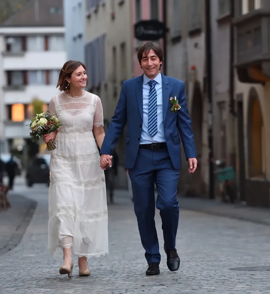 У порога ЗАГСа их ждал настоящий поезд, который отвез всех на знаменитый Рейнский водопад. Там они пересели на кораблик, чтобы выпить на борту глинтвейну за счастье всех сразу и подойти вплотную к падающей воде. А перед рестораном — еще один сюрприз: трехметровый альпийский рог, на котором музыкант сыграл тоже что-то про счастье всех и везде.