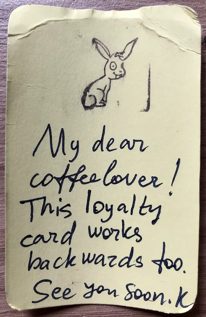 На маленьком кусочке картона стояла знакомая ему печать с ослом и было написано: «Мой дорогой любитель кофе! Эта карта лояльности работает и в обратную сторону. Скоро увидимся. К»