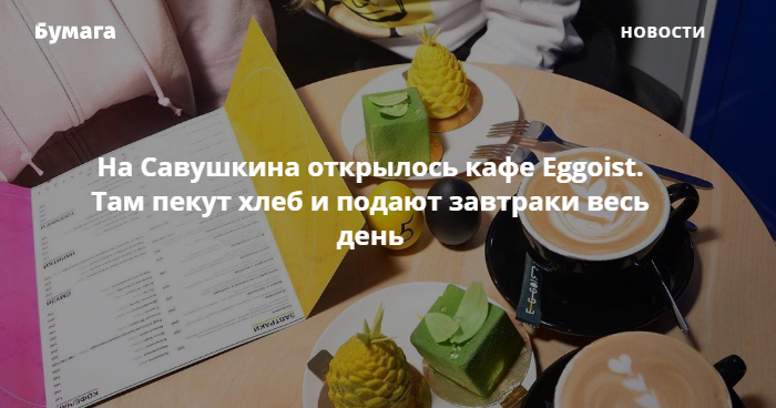 В торгово-развлекательном комплексе «Меркурий» на улице Савушкина, 141А открылось кафе с завтраками Eggoist. Меню заведения разработал шеф-повар Кирилл Шишов, а за напитки отвечает Кирилл Ульянов.