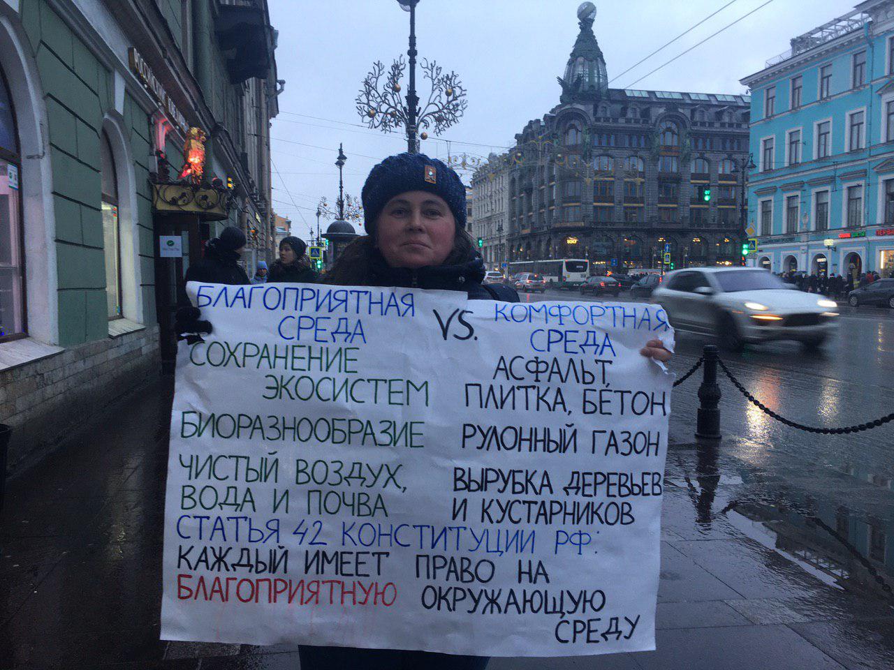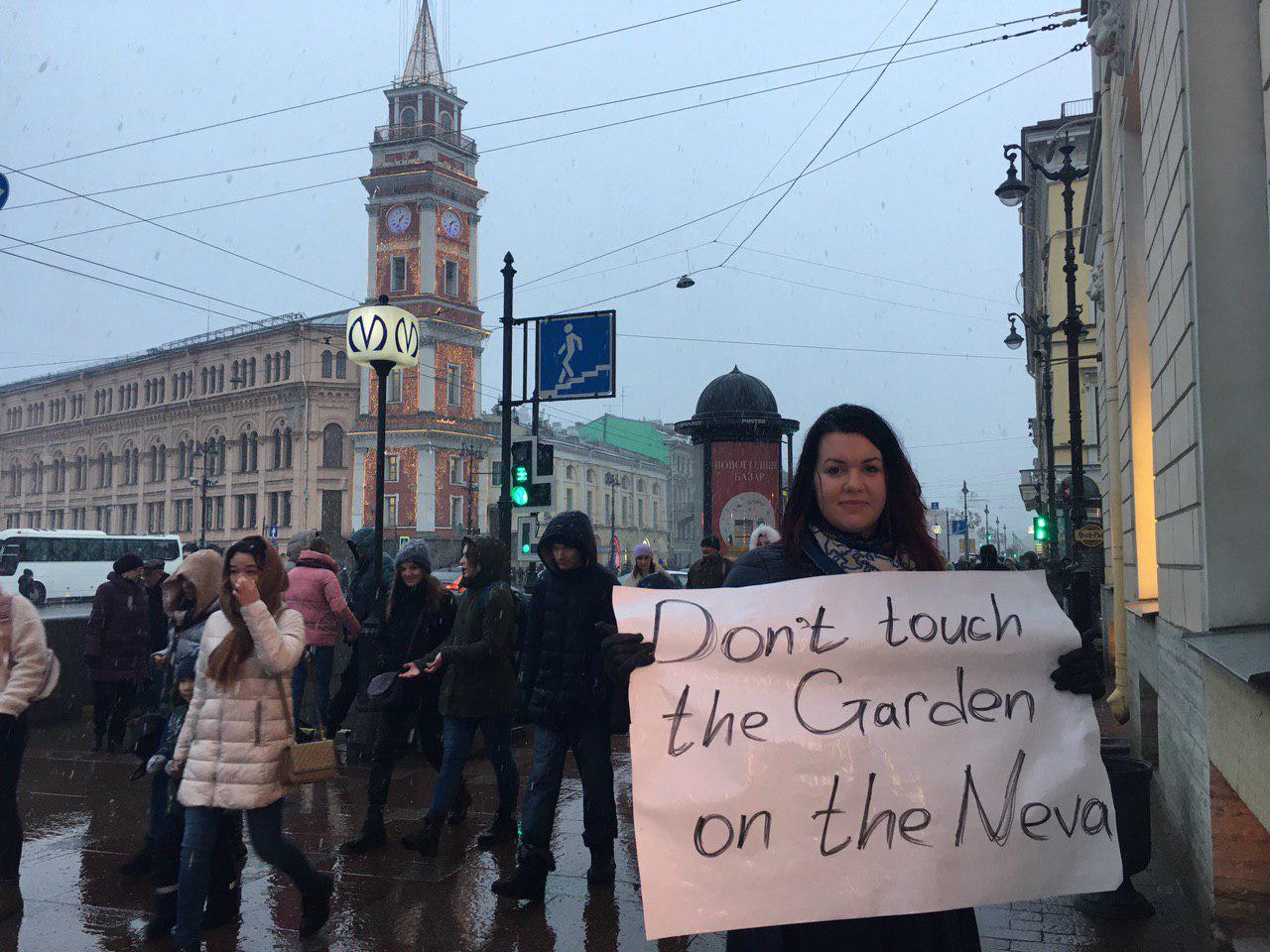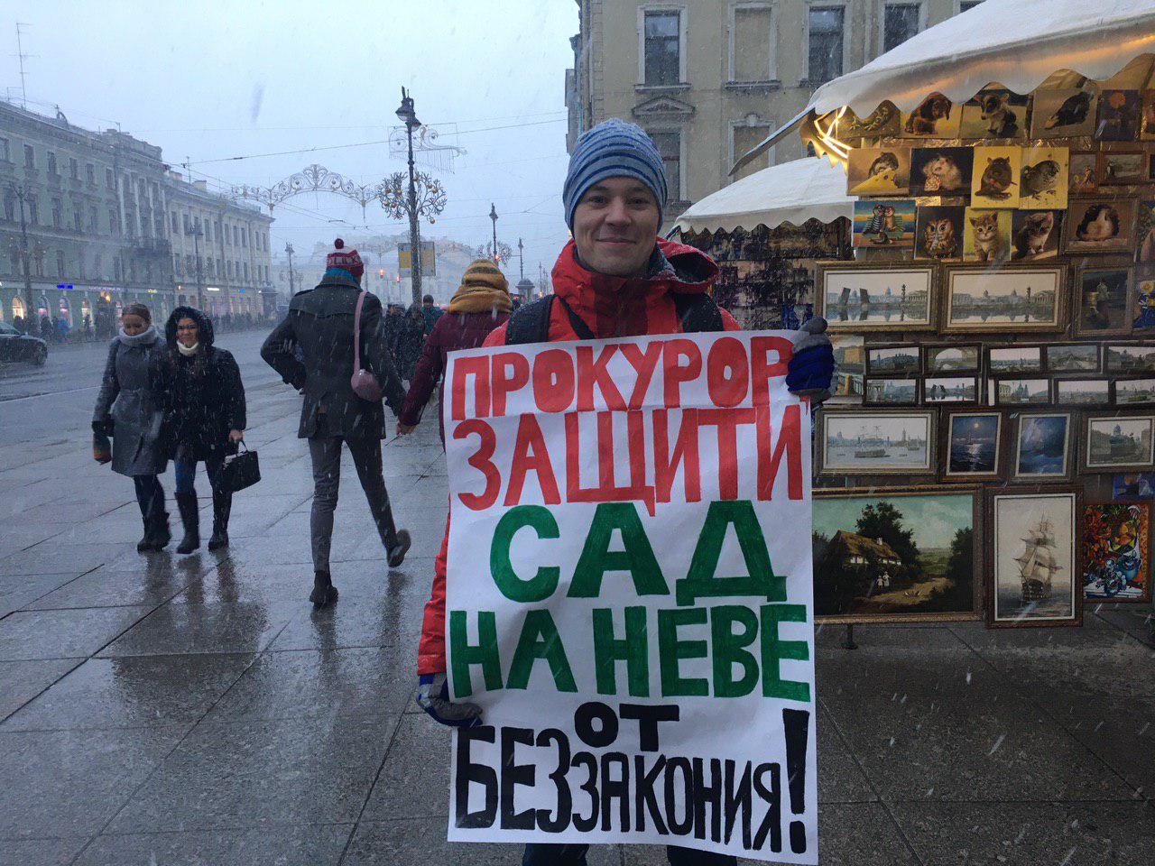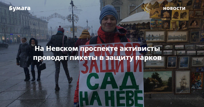 Около 40 активистов провели одиночные пикеты на Невском проспекте в защиту парков и скверов Петербурга. Об этом сообщает координатор общественного движения «Красивый Петербург» Красимир Врански.
