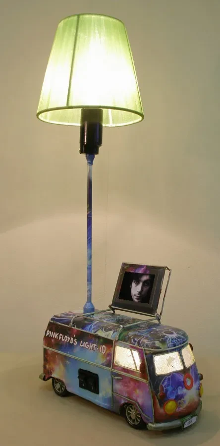 И все это тоже стало Светом. Лампа, посвященная Pink Floyd, зачаровывает мой взгляд. Маленький психоделический автобус c надписью на борту Wish you were here и с номером 1967 впереди и 1975 сзади раскрашен сиреневыми разводами, оранжевыми пятнами и розовыми кляксами. Лобовое стекло разбито. Красными ушами торчат зеркала заднего вида. Вместо фар — яичница-глазунья. На крыше из толстой рамки, густо покрашенной золотом, глядит на нас знакомое лицо с черными запавшими глазами: Сид Баретт! И все это безумие на маленьких колесах венчает абажур в складочках, наполненный ровным, спокойным светом.