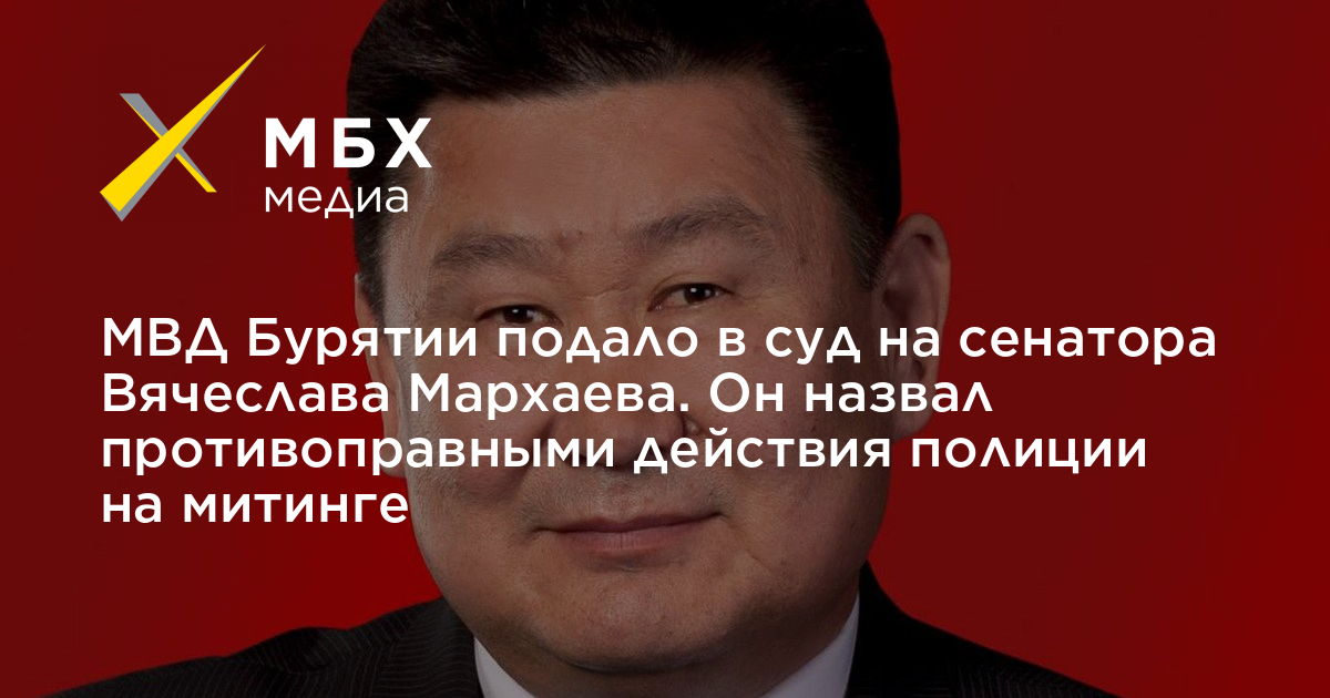 МВД Бурятии подало иск о защите деловой репутации к сенатору Вячеславу Мархаеву из-за его выступления в Совете Федерации, во время которого он просил главу Верховного суда проверить действия полиции и Росгвардии при задержаниях на акции в Улан-Удэ 12 сентября. Об этом сообщил «МБХ медиа» адвокат Сергей Федоров.