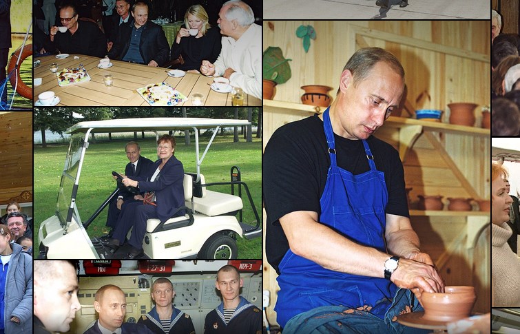 На снимках Путин встречается с политиками, обнимает школьную учительницу, рыбачит, позирует на фоне египетских пирамид и лепит горшок из глины.