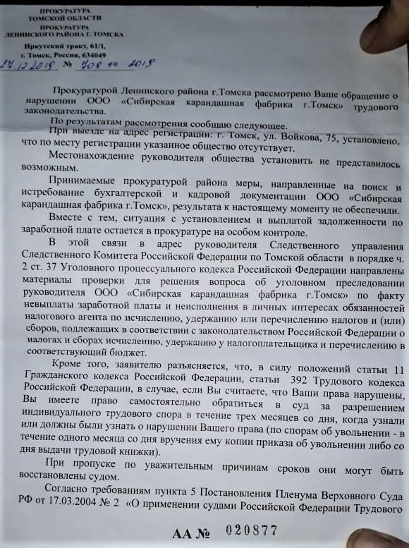 В Арбитражный суд Томской области поступило исковое заявление о признании Сибирской карандашной фабрики банкротом. Иск подала новосибирская типография «Сити-пресс», которая поставляла упаковку для карандашей. Сумма исковых требований — 500 тысяч рублей. Журналист ТВ2 дозвонился до компании, но там отказались комментировать дело, сославшись на то, что не владеют информацией, при этом с кем можно пообщаться по данному вопросу – не сообщили.