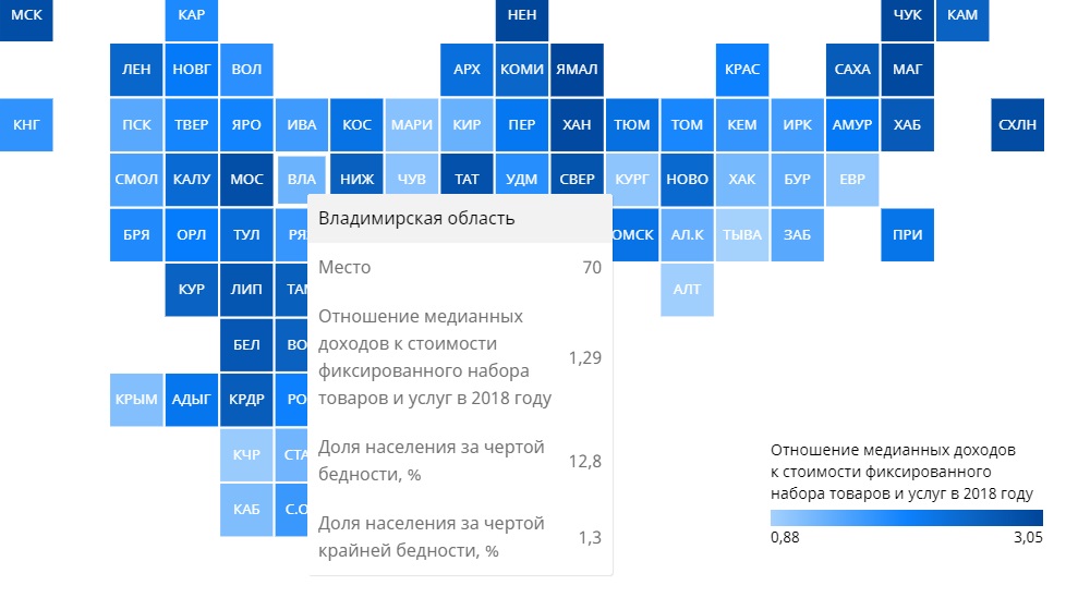 Критерием для составления рейтинга служило соотношение медианной зарплаты к стоимости фиксированного набора товаров и услуг. Медианная зарплата – сумма, выше и ниже которой получают зарплату одинаковое количество работников региона. Во Владимирской области соотношение медианной зарплаты к стоимости фиксированного набора составило 1,29. Это 70 место из 85.