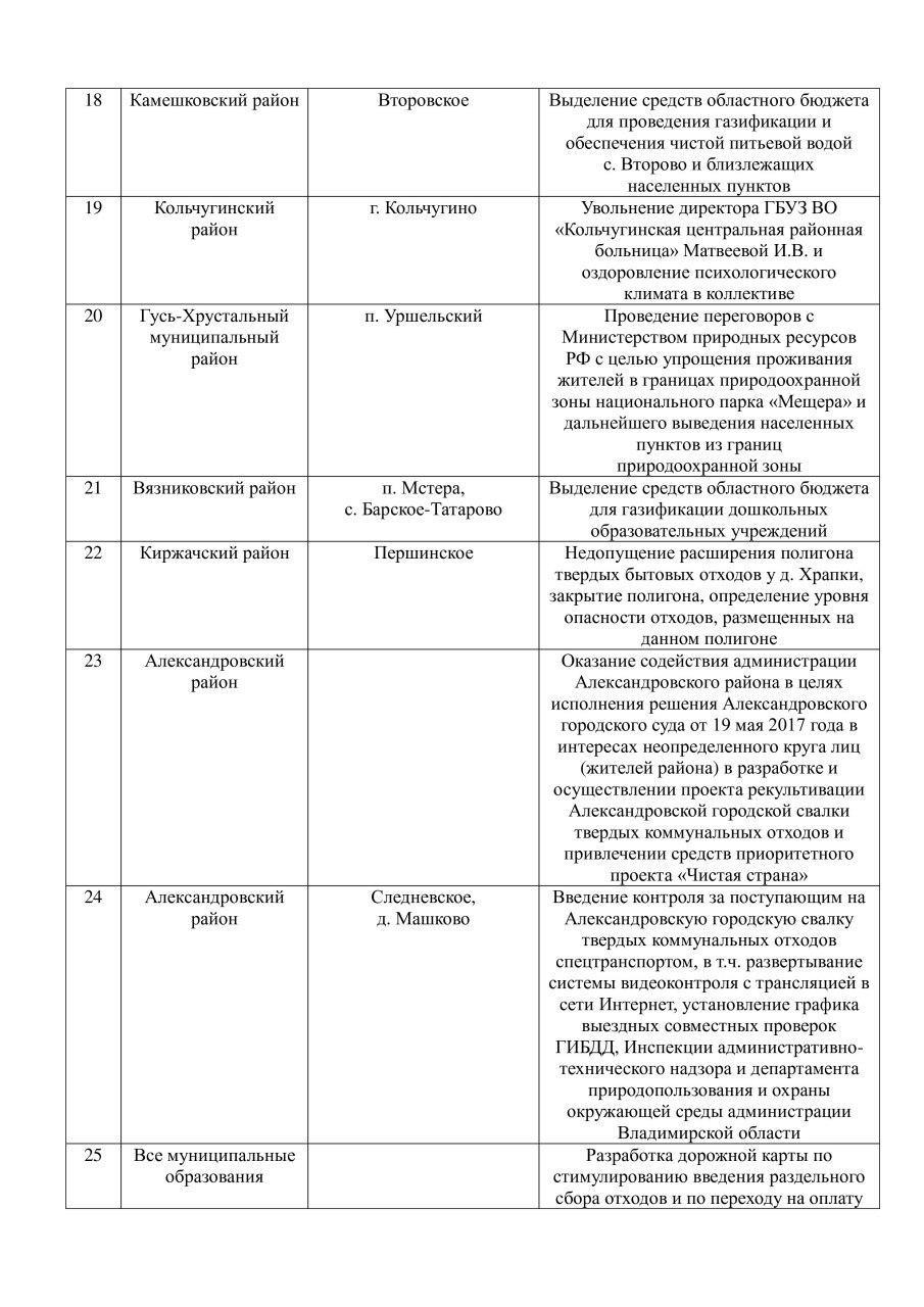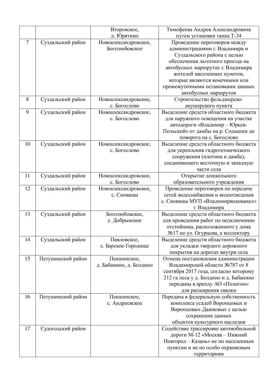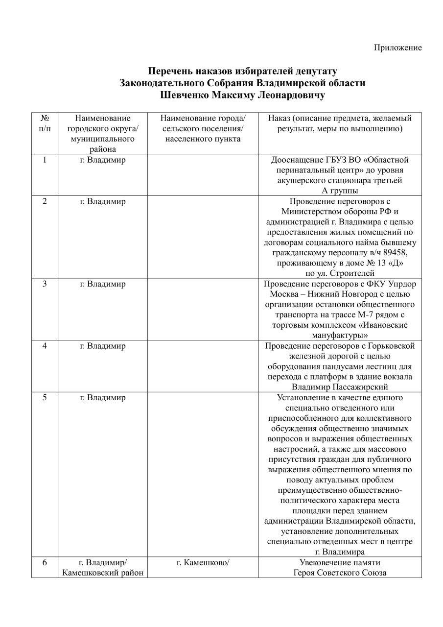 “Список Шевченко” состоит из 28 пунктов и касается как всей территории региона, так и отдельных муниципальных образований – г. Владимира, Суздальского, Камешковского, Судогодского, Петушинского, Александровского, Киржачского, Гусь-Хрустального, Вязниковского районов.