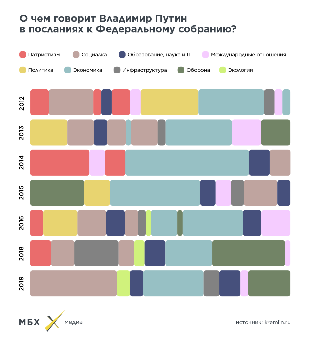 В отличие от ежегодной пресс-конференции и «Прямой линии», послание к Федеральному собранию — не личная инициатива, а конституционная обязанность Владимира Путина. Текст обращения Путин, конечно, пишет не сам: ему помогают администрация, правительство и сторонние эксперты; но всегда внимательно его читает, предлагает темы и дает свои замечания. «МБХ медиа» проанализировали тексты всех посланий за последние два президентских срока, чтобы увидеть, о чем и сколько говорил президент в прошлые годы.