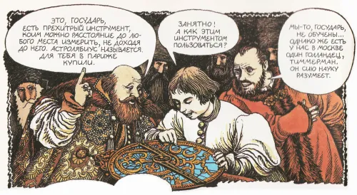 «Пётр Великий» (1992). Юный Пётр изучает астролябию. Астролябия Петра хранится ныне в Зимнем дворце Петра, расположенном рядом с основным зданием Эрмитажа