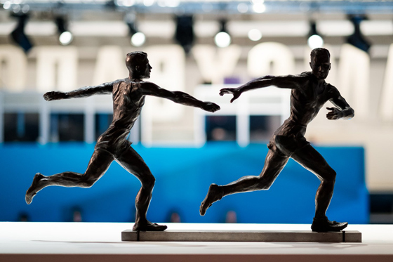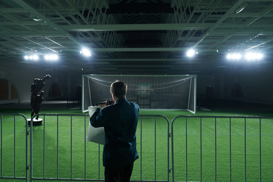 Первое и главное, по поводу чего шли интенсивные конфликты среди критиков, — сама идея куратора Семена Михайловского организовать из диалога двух художников футбольный матч, разбив выставку на сектора. Одни считают это насмешкой на границе с пошлостью, другие — удачным популизмом или симпатичной метафорой, но так или иначе особой глубины в решении никто не отмечал. Между тем главным в выставке стала не столько концепция, сколько ее воплощение. Дизайнер проекта, архитектор Антон Горланов, перекинул реальный мост в советское, перемешав тридцатые и шестидесятые в тонкой стилизации, напоминающей не то роскошные интерьеры клуба или бутика, не то застройку кинопавильона. Фасад Манежа оживили протянутые в колоннаде длинные флаги неповторимо ленинградских холодноватых цветов с лаконичными символами двух столиц.