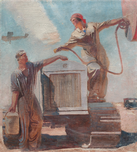 И все же у выставки были и свои собственные задачи. Дейнека и Самохвалов — не просто два ярких лидера довоенного модернизма, близких по взглядам, позициям и стилистике. Они были флагманами двух художественных объединений, которые в равной степени претендовали на формирование «советской фрески» — монументального стиля тридцатых. Дейнека считался лидером ОСТа — московского Общества станковистов; Самохвалов выделялся в ленинградском «Круге художников».