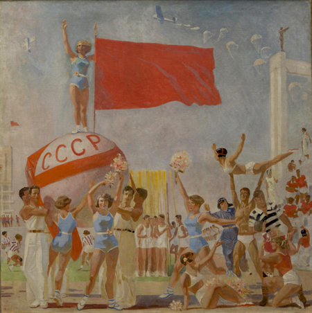 © Нижнетагильский музей изобразительных искусств Александр Самохвалов. Советская физкультура. 1935. Холст, масло Всей этой тяжести конца столетия, революционной крови, пота и пыли совершенно нет у декоративных и оптимистичных (даже в поздние годы) Дейнеки и Самохвалова. Поэтому решение «окутать» интернациональное культурное событие именно их живописью можно воспринимать как классический экспортный шаг советской власти. Недаром именно картины остовцев с юными лыжниками, комсомолками и летчиками украшали советский павильон на Венецианской биеннале 1932 года, а панно Дейнеки «Знатные люди Страны Советов» утверждало достижения СССР в павильоне Иофана и Мухиной для Всемирной выставки в Париже 1937 года.