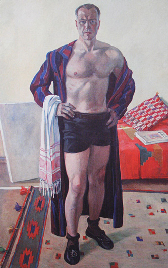 © Михаил Вильчук / Государственная Третьяковская галерея, Москва Александр Дейнека. Эстафета. 1945. Бронза Закончу статью на лирической, примирительной ноте, так, чтобы даже следовать в фарватере Кристины Кэр. Тема «взгляда из будущего» действительно интересна. Для меня она резче всего подсветила поздний автопортрет Дейнеки: на известном полотне 1948 года художник, словно в последний раз, сосредоточенно экспонирует железное тело плейбоя былых времен, облачившись в черные спортивные трусы, длинный халат и гимнастические туфли с носками.