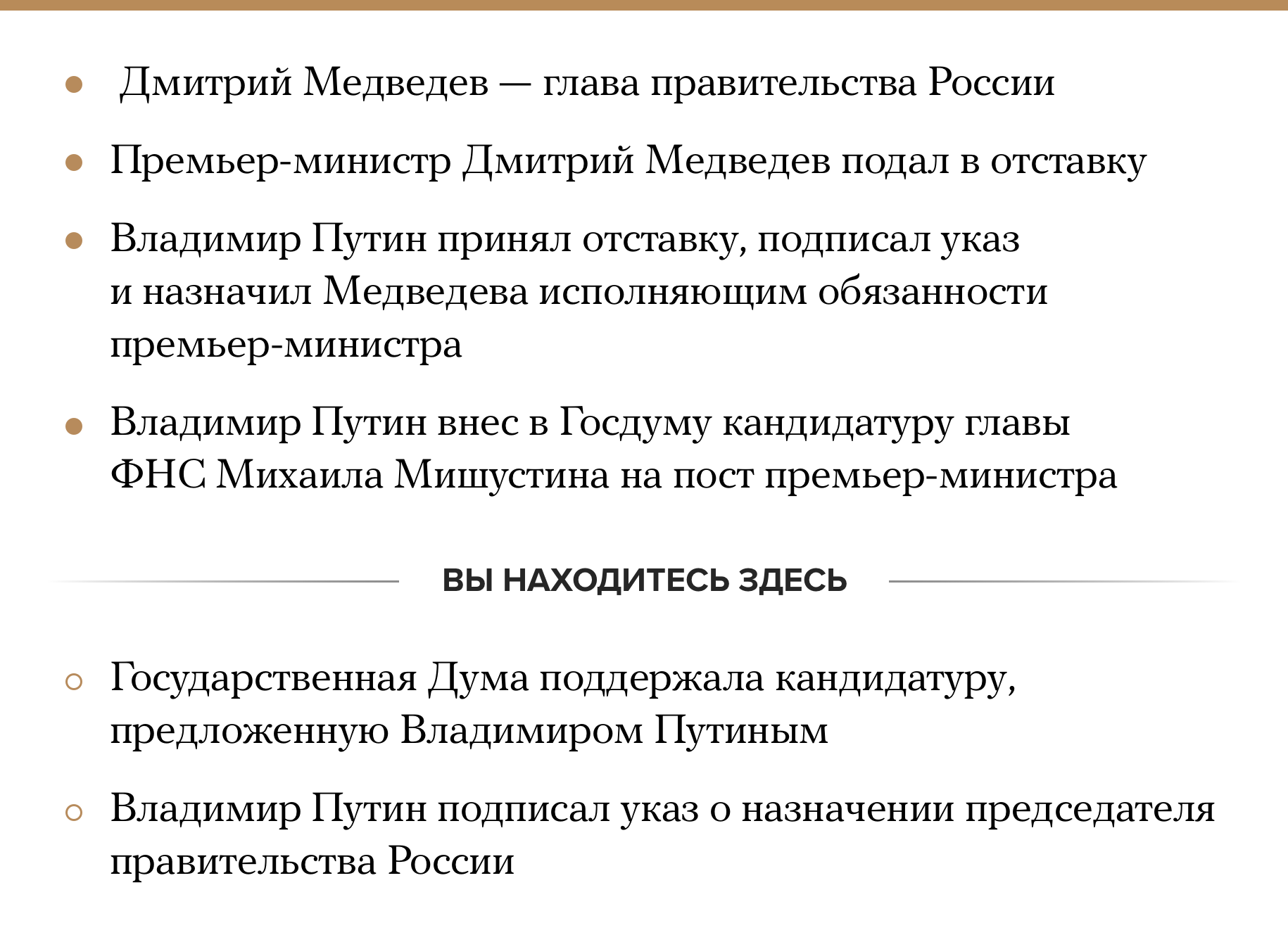 Дата15.01.2020АвторСкрытИсточникМедузаСохранённая копияInternet ArchiveOriginal MaterialShow translationПравительство ушло в отставку. Что будет дальше? Фото в анонсе: Алексей Никольский / Pool / Reuters / Scanpix / LETA