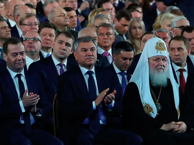 Д.Медведев, В.Володин и патриарх Кирилл на церемонии оглашения послания президента Федеральному собранию / kremlin.ru Во-первых, несмотря на официальную пропаганду, Владимир Путин не воспринимается населением как «отец нации» — никто не отсчитывает историю России от 1999 года, даже про 1991 год вряд ли кто-то начинает рассказ, говоря про Россию.