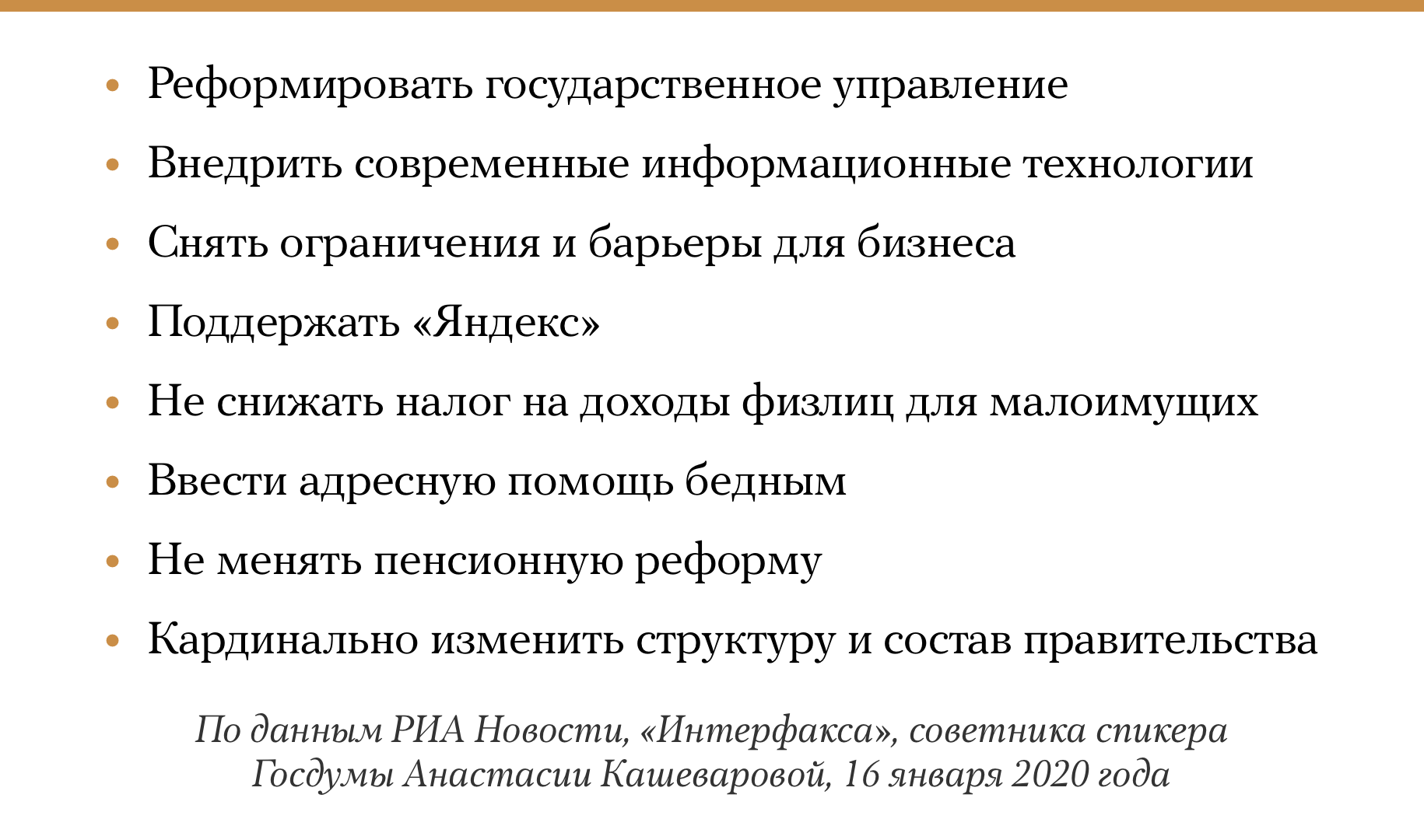 Глава ФНС Михаил Мишустин, кандидатура которого выдвинута на пост премьер-министра России, утром 16 января встретился с представителями фракций Госдумы. Во время общения с депутатами «Единой России» Мишустин рассказал, чем намерен заниматься во главе правительства: сократить издержки для бизнеса и провести институциональные реформы. На встрече с КПРФ он заявил, что изменит структуру правительства, но не станет снижать НДФЛ для малоимущих или отменять пенсионную реформу. Кроме того, Мишустин общался с депутатами ЛДПР и «Справедливой России», но об итогах этих встреч на момент публикации не сообщалось.