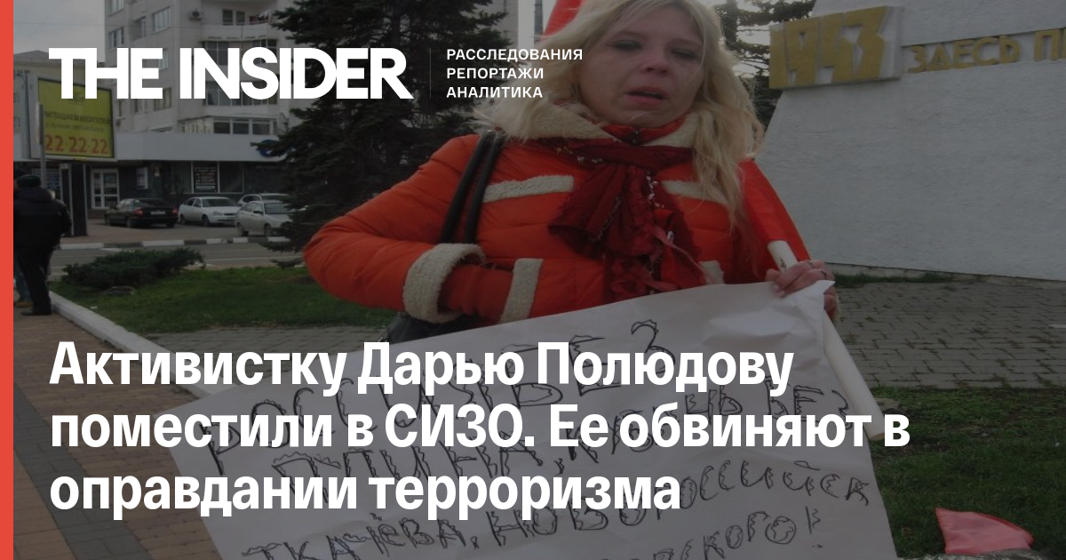 Активистку Дарью Полюдову поместили в московский СИЗО № 6, ей предъявили обвинения по статьям об оправдании терроризма и призывам к нарушению территориальной целостности России. Об этом сообщает «ОВД-Инфо» со ссылкой на мать активистки Татьяну.