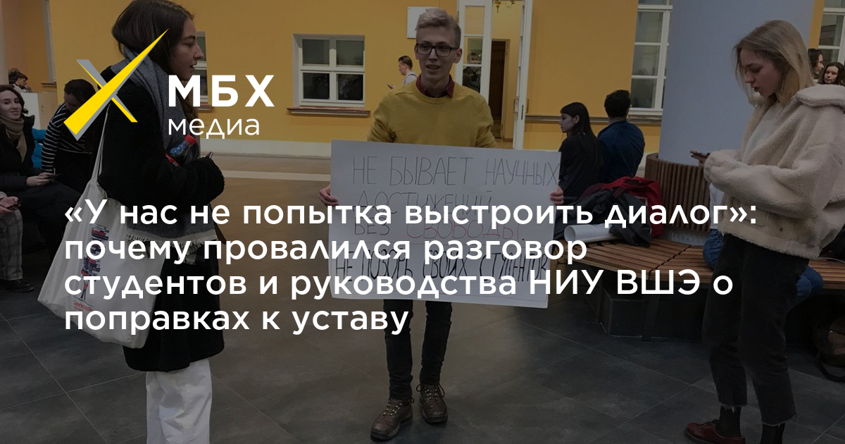 В Высшей школе экономики хотят запретить студентам и сотрудникам высказываться на политические темы и заниматься в вузе правозащитной деятельностью, а также лишить статуса студорганизаций все университетские СМИ. Всю вторую половину дня в ВШЭ студенты пытались договориться с администрацией об отмене этих поправок. Впрочем, разговор скоро превратился в ругань, прийти к согласию так и не удалось.