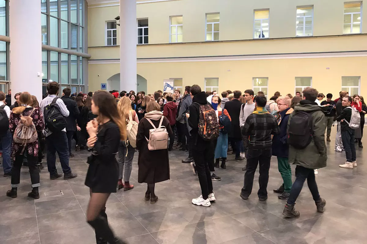 Сначала студенты собрались в атриуме корпуса. Успели выступить редактор бывшего студенческого издания DOXA Армен Арамян и пресс-секретарь студсовета Христофор Космидис, которые призвали сформулировать свои требования к администрации Вышки.