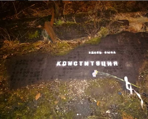 В Петербурге уличный художник Loketski создал работу памяти российской Конституции — на Старожиловской улице в пригороде появилась памятная плита с надписью "Здесь была Конституция". Рядом с табличкой возложены две гвоздики, перевязанные лентой.