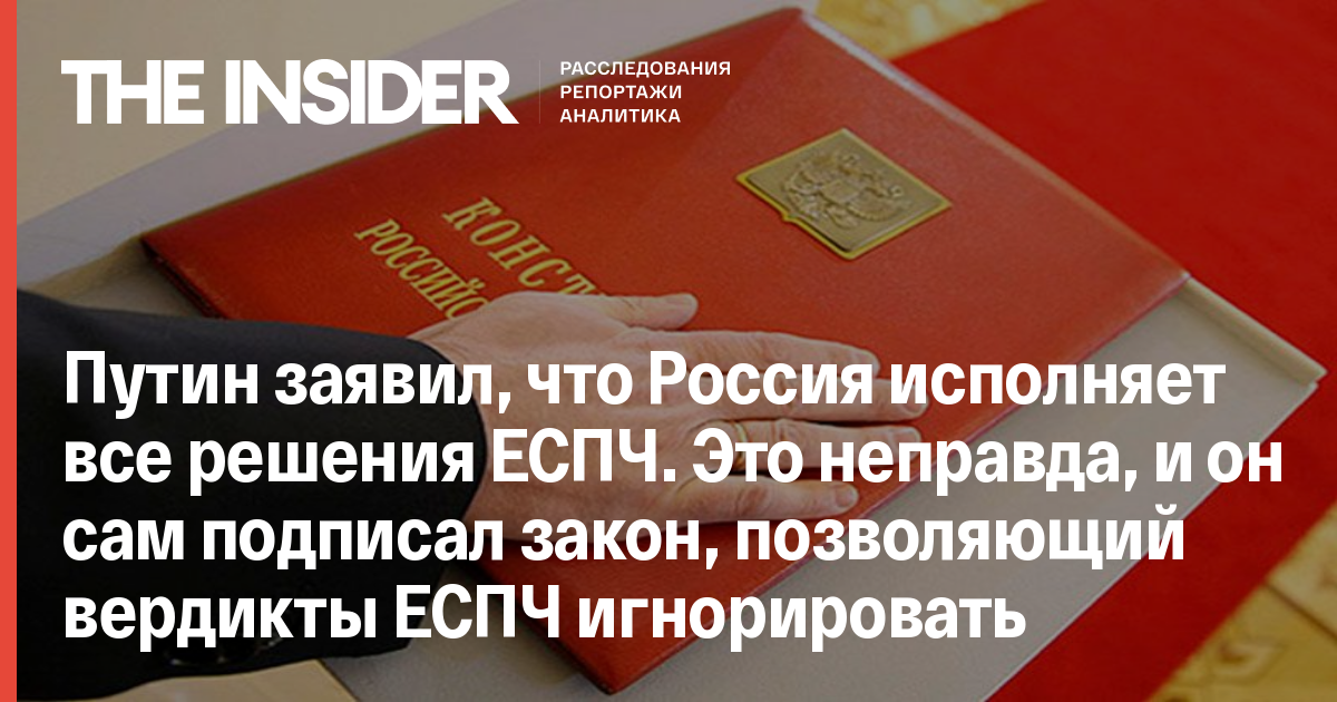 Путин заявил, что Россия исполняет все решения ЕСПЧ. Это неправда, и он сам подписал закон, позволяющий вердикты ЕСПЧ игнорировать