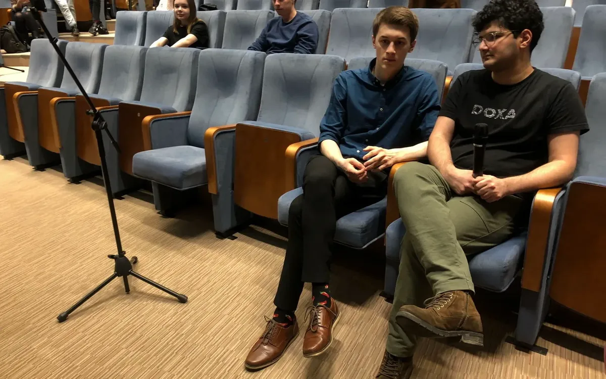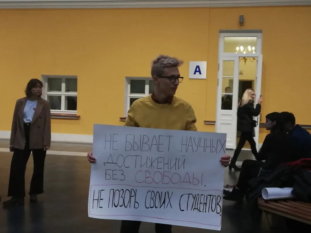 После Космидиса микрофон отдают другим студентам и аспирантам. Один из них — молодой человек из Перми, который говорит о том, что кампания против изменения внутренних документов ВШЭ началась и в других кампусах: в Санкт-Петербурге, Нижнем Новгороде и в его родном городе.