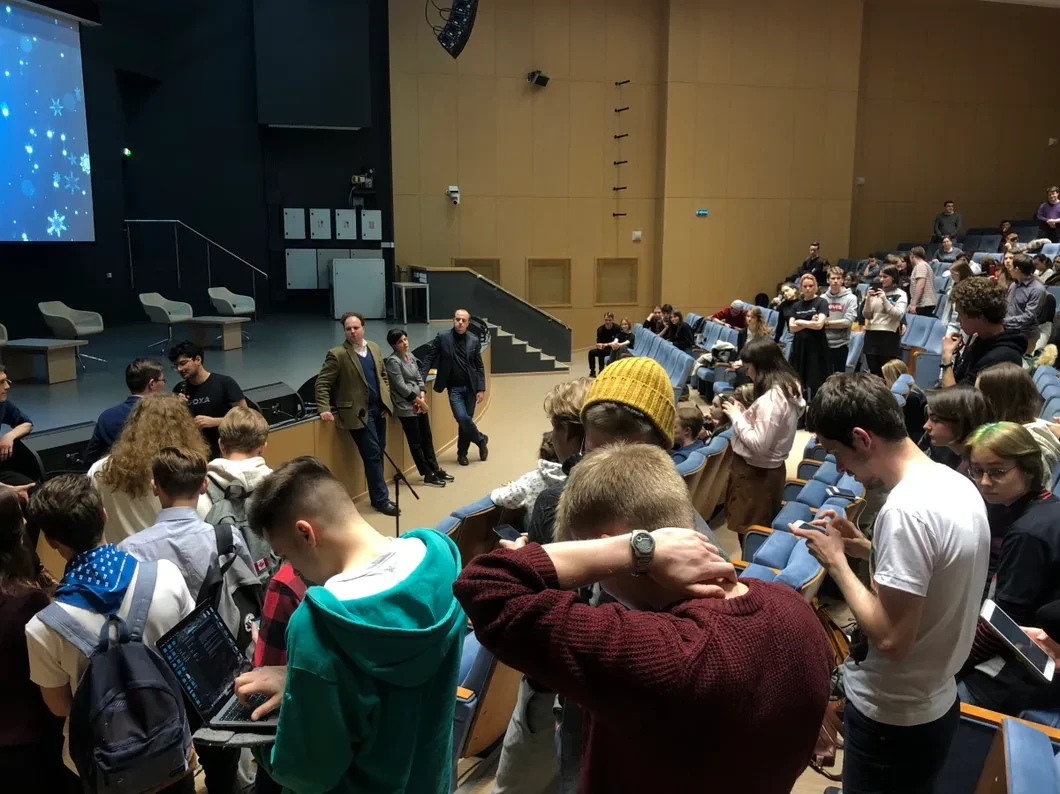 В Культурном центре студентов уже ждут. У сцены в большой аудитории на пятьсот человек стоят глава отдела информационной политики Олег Солодухин, проректор ВШЭ Валерия Касамара и еще несколько сотрудников администрации. Пока студенты рассаживаются, проректор говорит, что возможность обсудить поправки у них уже была. Немного ранее прошла встреча со студенческими медиа (закрытая), а еще обсуждение по инициативе администрации университета, которое студенты могли посетить. Только назначено мероприятие было уже после объявления о встрече в атриуме. После нескольких выступлений студентов Касамара говорит, что не видит проблем в новых правилах.