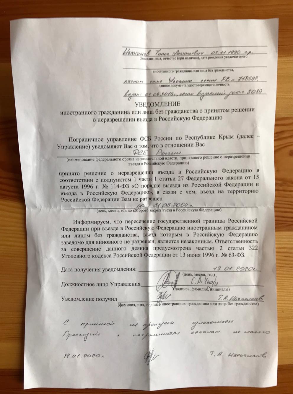 В постановлении, которое вручили Ибрагимову 18 января 2020 года на админгранице Крыма с Херсонской областью сказано, что ему запретили въезд в Россию и Крым до конца мая 2054 года. По словам, журналиста все проходило вежливо, но внятного объяснения, с чем связан запрет, нет ни в постановлении, ни в устном объяснении.