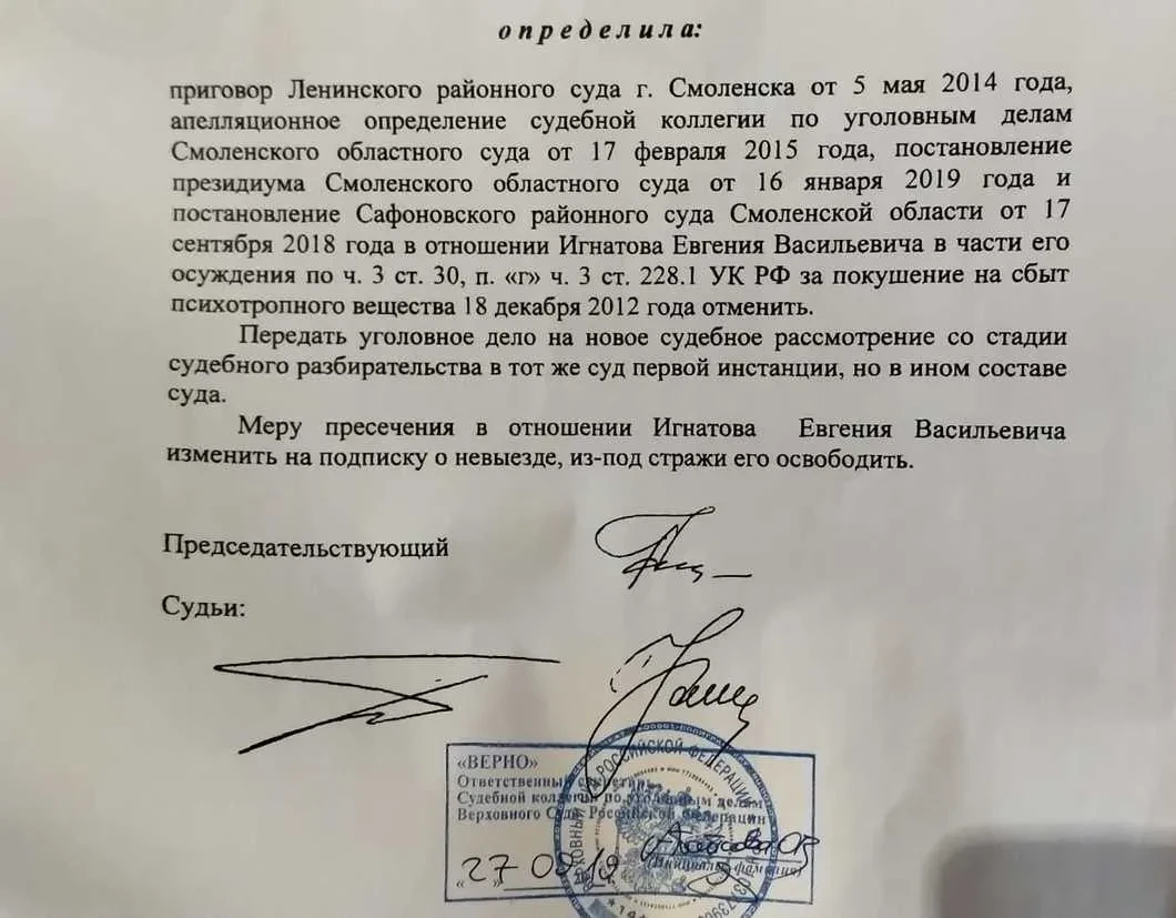 В марте 2018-го состоялся суд, на котором было доказано: Евгений Игнатов, отбывающий наказание по статье 228 УК РФ («незаконный оборот наркотиков»), — невиновен. И прокуратура потребовала пересмотреть его приговор, но областной суд не отправил дело на пересмотр в первую инстанцию, а просто уменьшил срок наказания на три года…