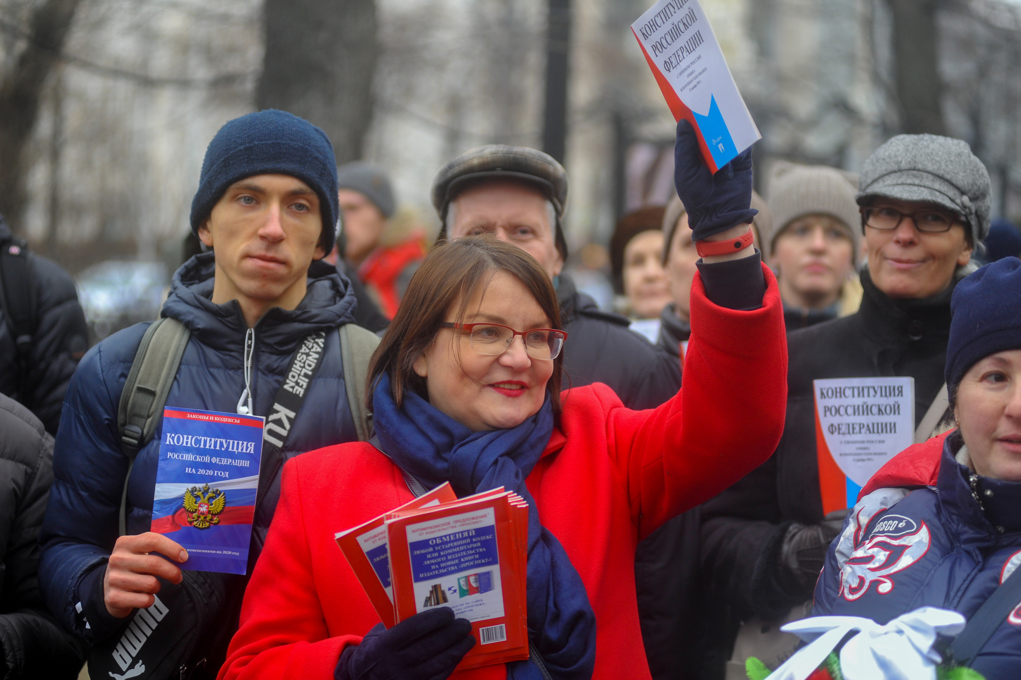 Некоторые участники шествия несли в руках конституцию России в знак протеста против "конституционного переворота", которым они называют предложенные президентом Владимиром Путиным поправки к основному закону страны.