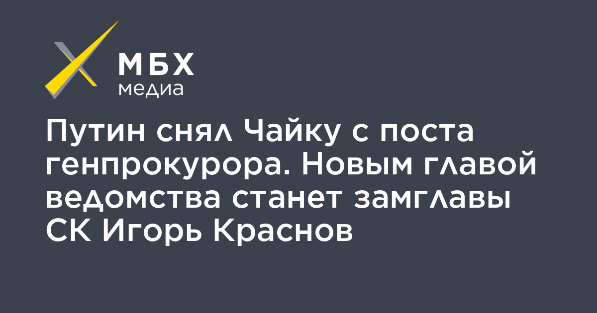 «Владимир Путин внес на рассмотрение Совета Федерации кандидатуру заместителя председателя Следственного комитета РФ Игоря Краснова на должность генерального прокурора РФ и предложение об освобождении от этой должности Юрия Чайки в связи с переходом на другую работу», — сообщили в пресс-службе.
