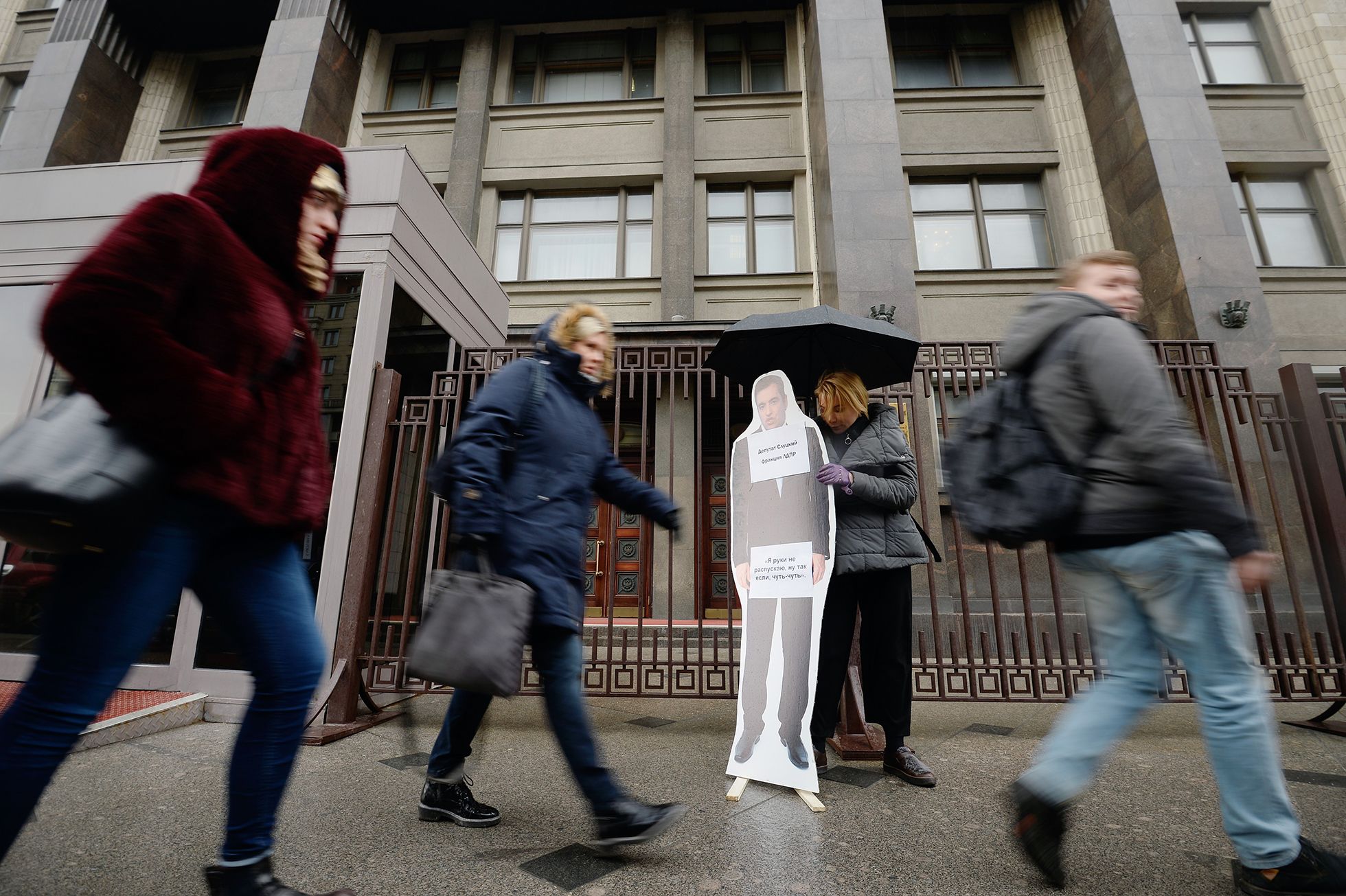 Эмин Джафаров / Коммерсантъ Алена Попова во время одиночного пикета «Нет домогательствам! Да исполнению законов депутатами!» у здания Госдумы. Москва, 2018 год