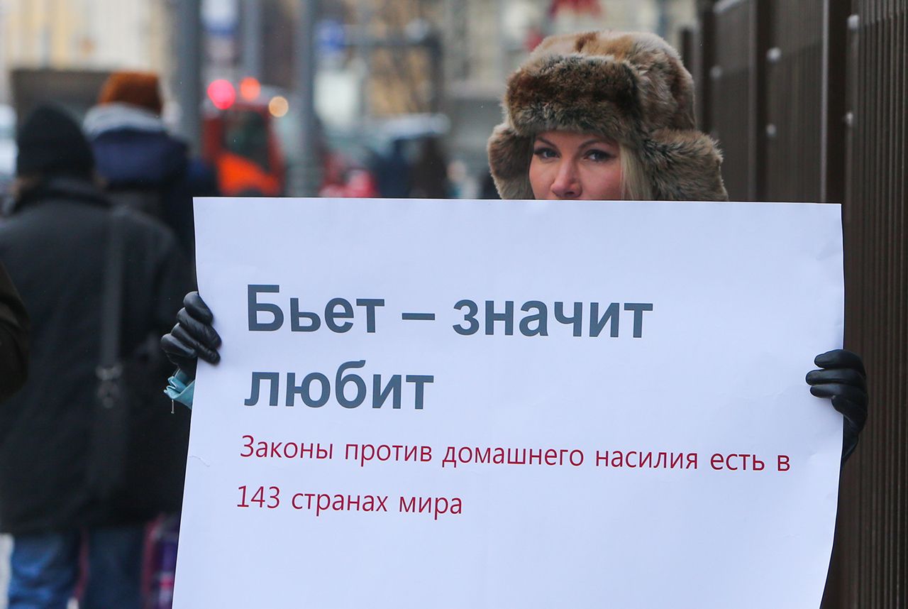 Владимир Гердо / ТАСС Алена Попова во время одиночного пикета против декриминализации побоев в семье около Госдумы. Москва, 2017 год