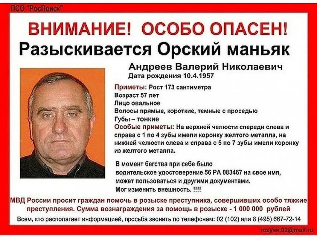 Я стала читать про орского маньяка. Ничего утешительного: орудовал с 2006 года, в 2012-м следователи оренбургского СУ СК вышли на его след, но Андреева спугнули, зачем-то вызвав на допрос, куда он не пришел. В гараже нашли молотки, топоры, пилы, в машине — следы крови. Свидетели опознали машину. Официально по делу Андреева проходят семь жертв — все молодые стройные девушки, которых он подбирал, когда те хотели поймать машину. Однако вне этих эпизодов за «орским маньяком» может числиться более 40 трупов — именно столько молодых женщин пропали в регионе в те годы при сходных обстоятельствах. В 2013 году оренбургское СУ СК объявило Андреева в розыск, за помощь в его поимке пообещали полмиллиона рублей. Позже сумму вознаграждения увеличили до миллиона.