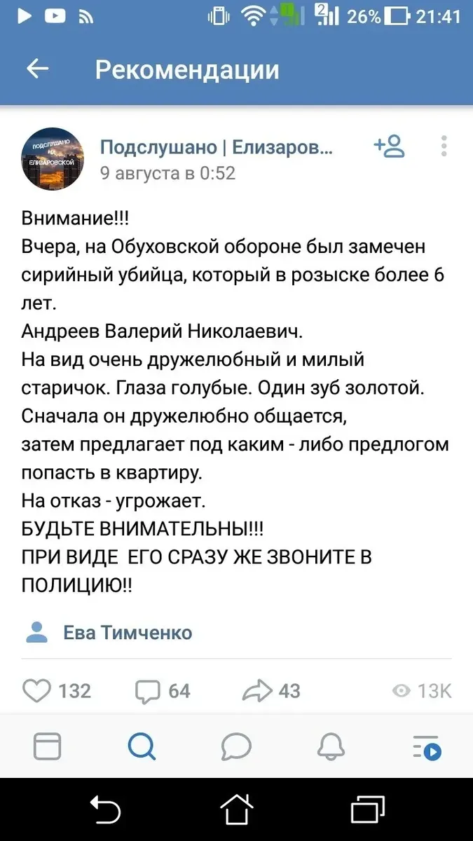 Прошло три дня, про мужчину с шоколадным батончиком мы больше не вспоминали. Пока я случайно не нашла в торковичской группе «ВКонтакте» ориентировку: фото нашего «утешителя» красовалось под крупными буквами «Внимание, розыск». На листовке был известный и разыскиваемый Интерполом «орский маньяк» Валерий Андреев. И попал он в нашу торковичскую группу неслучайно: в августе его видели в Петербурге.