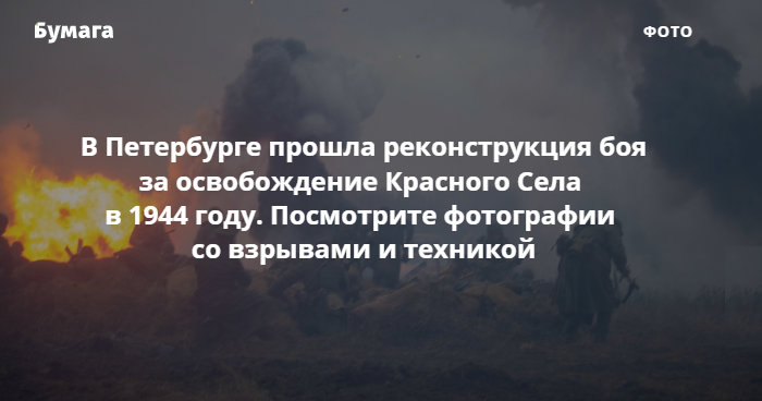 В честь 76-й годовщины освобождения Ленинграда от немецкой армии на Гатчинском шоссе состоялась военно-историческая реконструкция боя в Красном Селе. На ней показали наступление советских войск, технику и имитацию взрывов. Об этом сообщили организаторы.