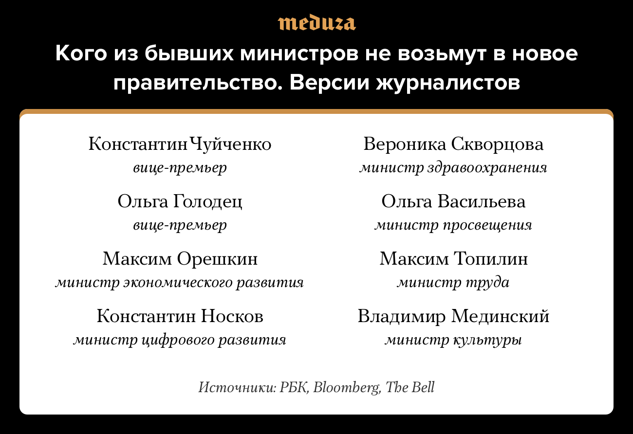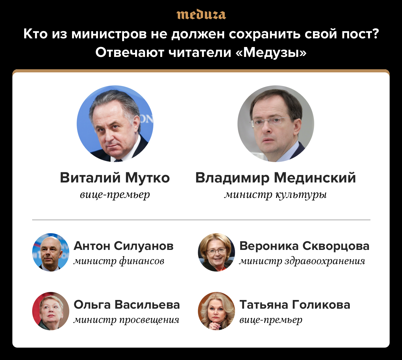 В конце прошлой недели мы спросили читателей, кого они не хотят видеть в новом правительстве. Похоже, Мишустин читает «Медузу»: почти все пожелания были выполнены (только Силуанов остался министром — но зато потерял пост вице-премьера).